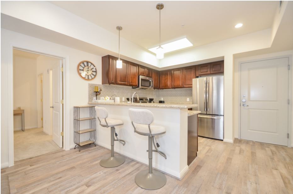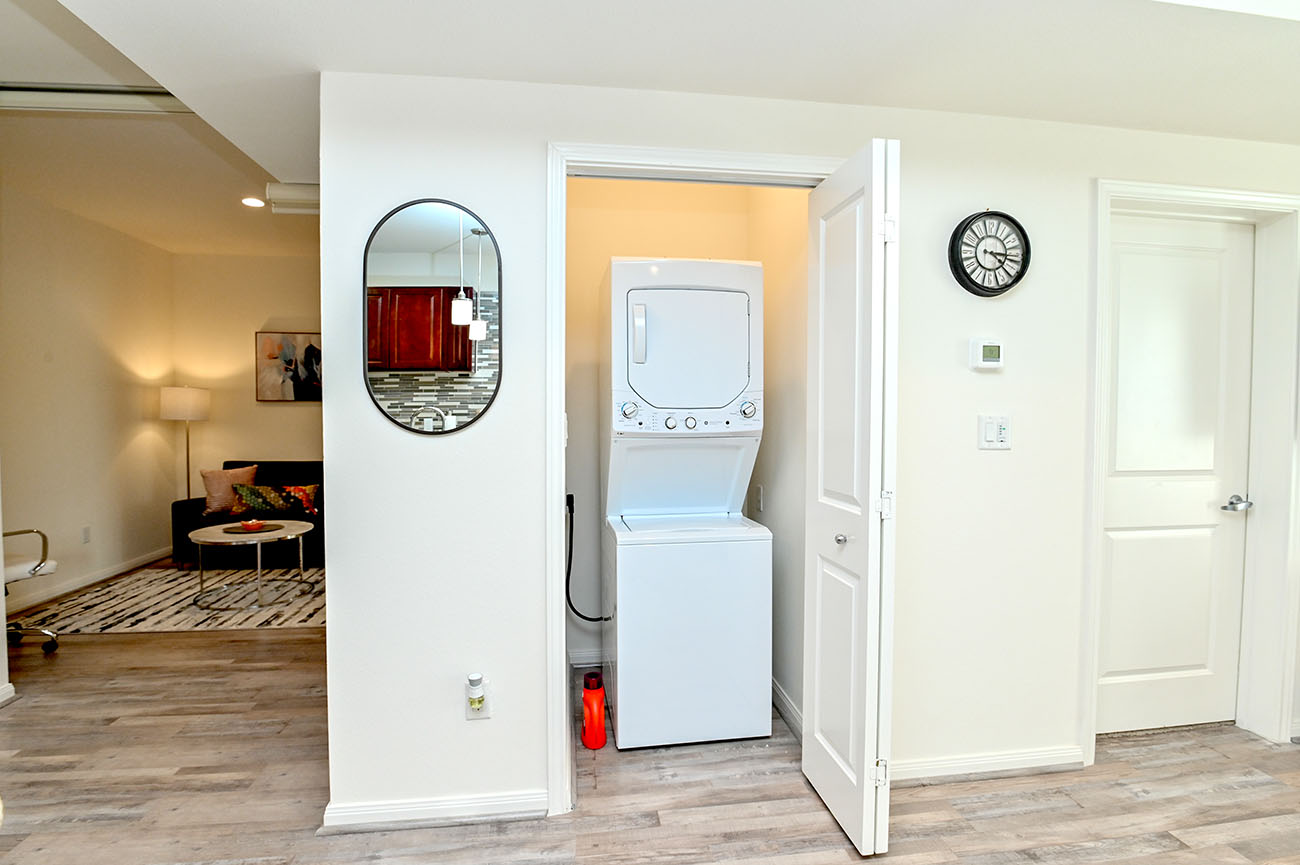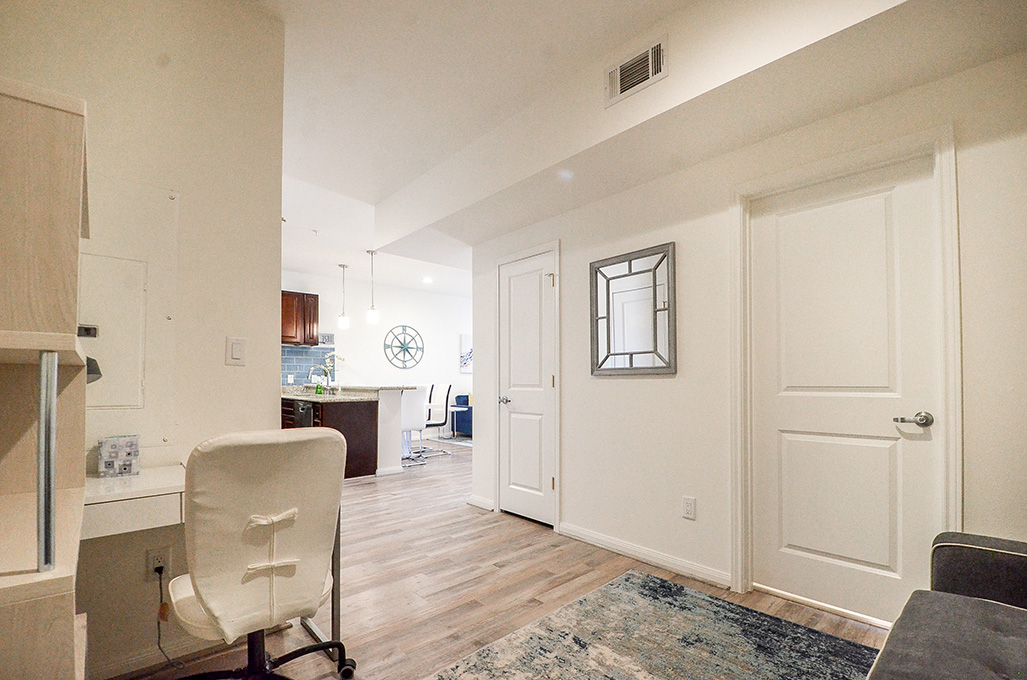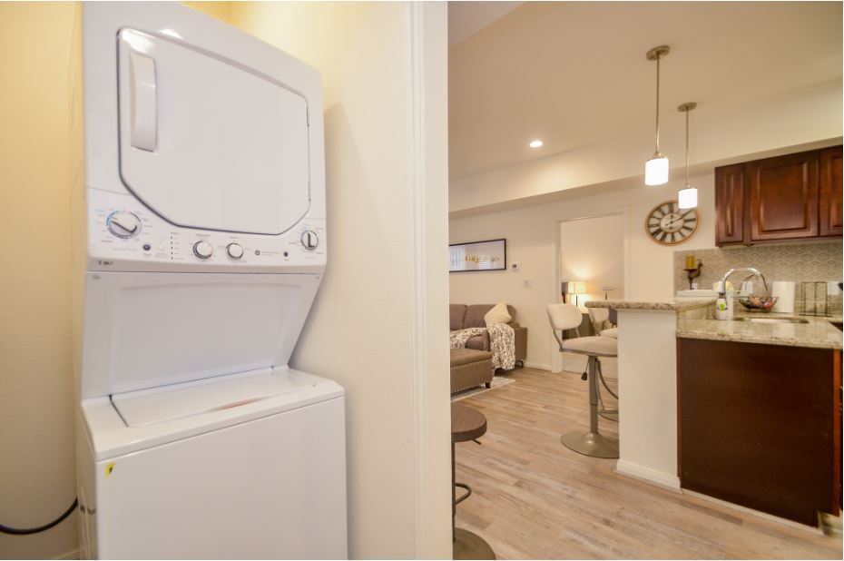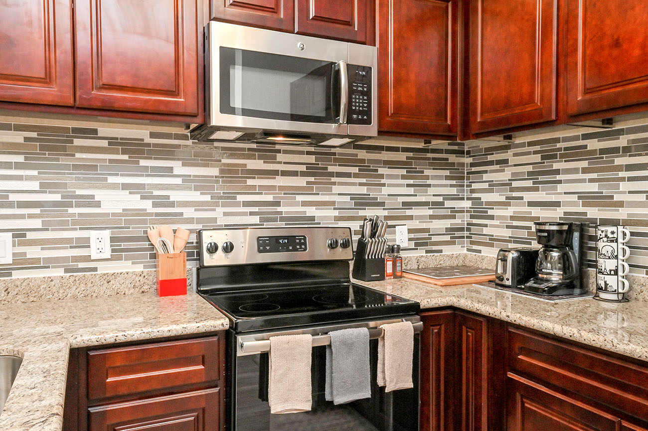 Enjoy a pleasant living environment with welcoming murals at the entrance and unique accent designs on each floor. Our short-term apartment rentals feature fully equipped gourmet kitchens with stainless steel appliances, granite countertops, breakfast bars, spacious bedrooms, and in-unit washers and dryers for your convenience.