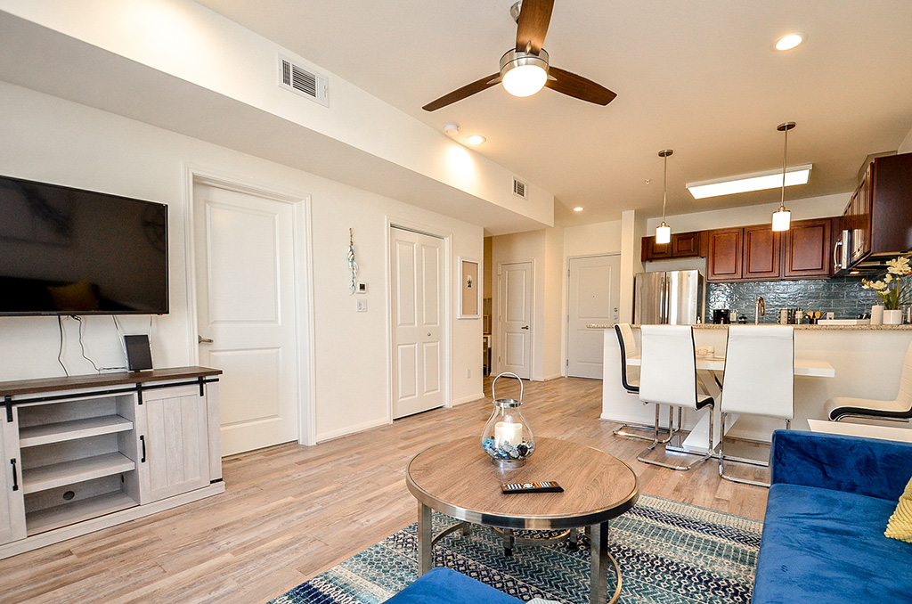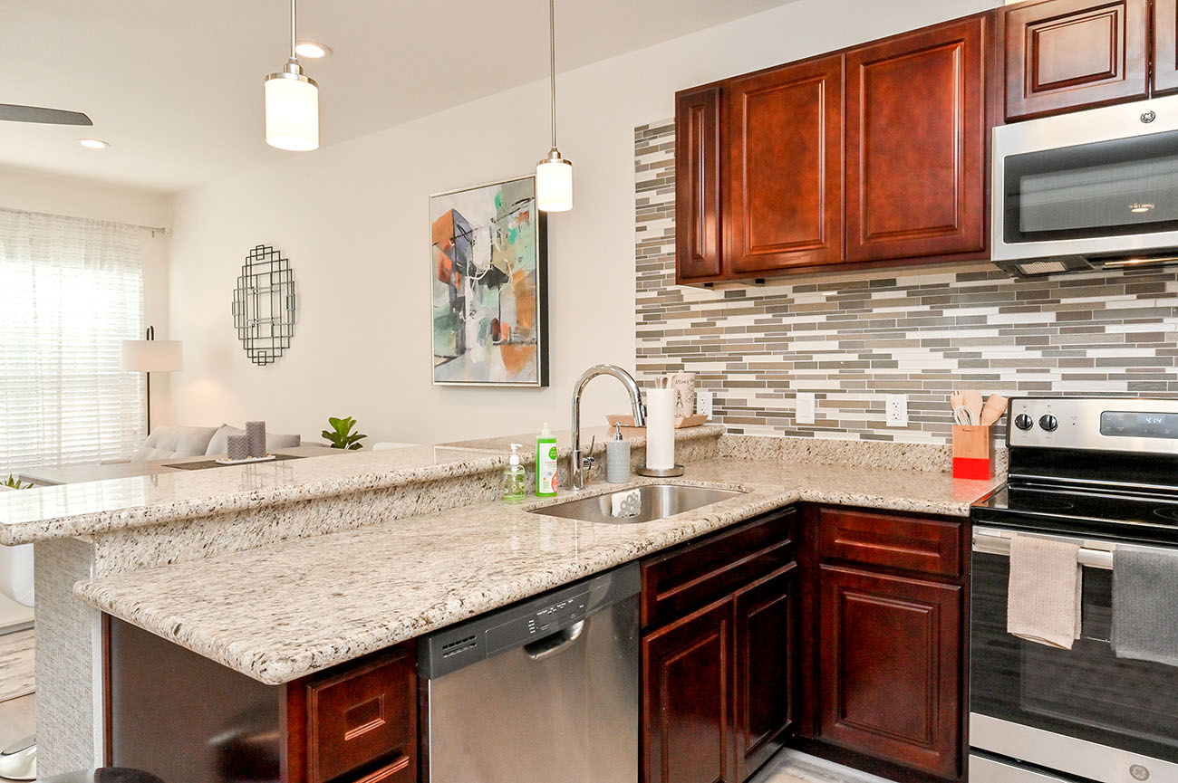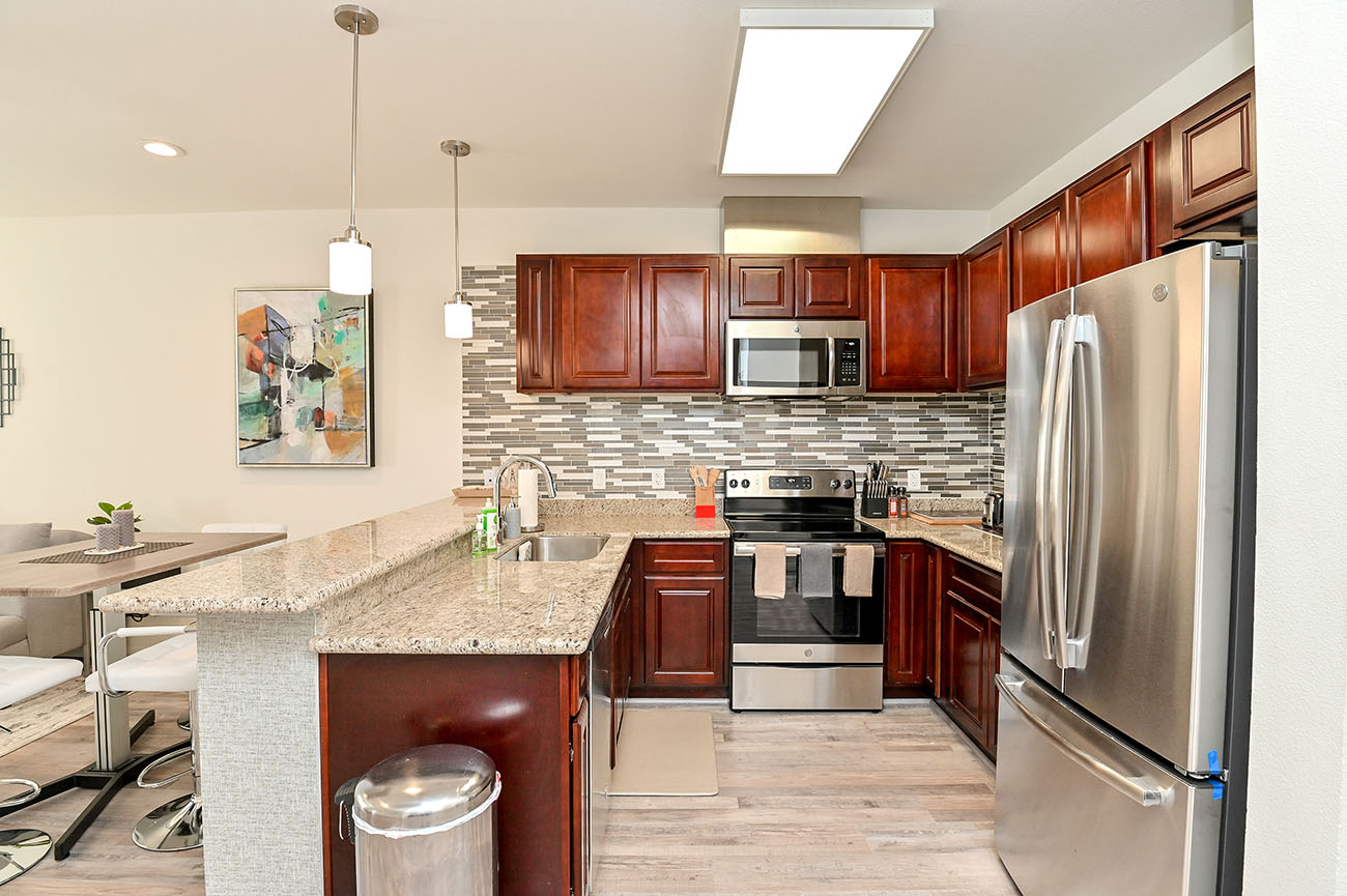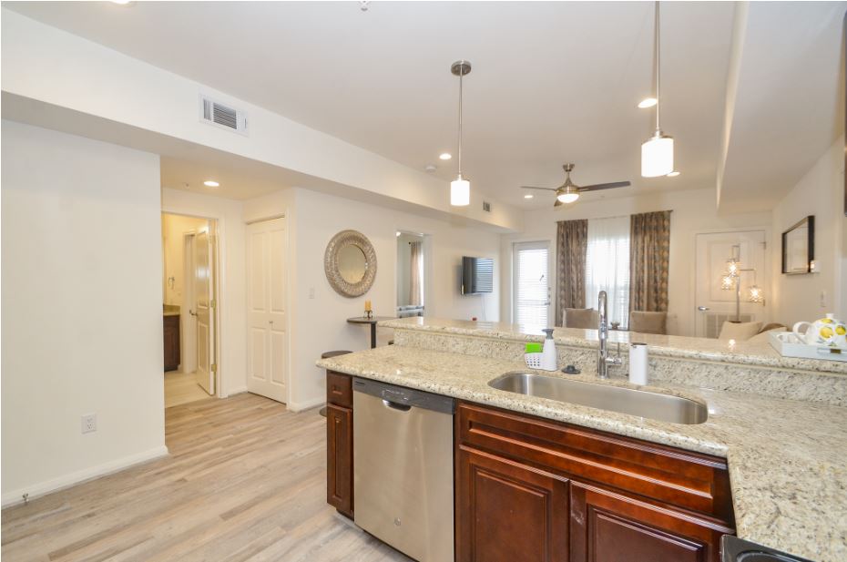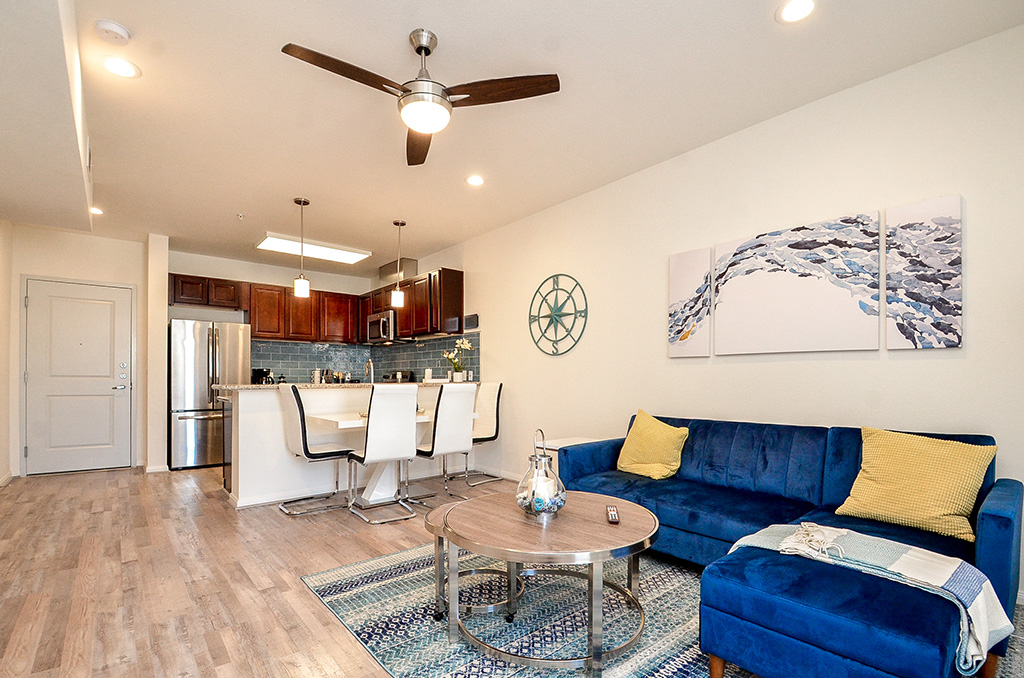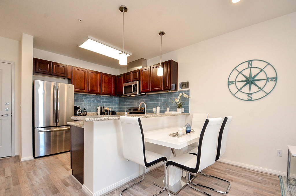 Enjoy a pleasant living environment with welcoming murals at the entrance and unique accent designs on each floor. Our short-term apartment rentals feature fully equipped gourmet kitchens with stainless steel appliances, granite countertops, breakfast bars, spacious bedrooms, and in-unit washers and dryers for your convenience.